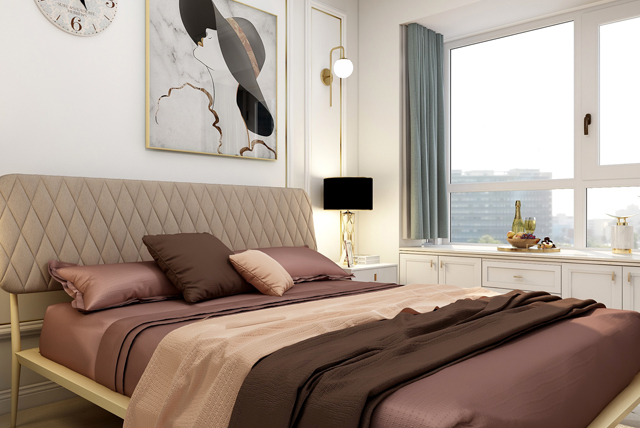 主臥墻面沿用客廳金色線條,同樣加上石膏線條與掛畫,讓空間富有節(jié)奏感的同時(shí)不失復(fù)古高級(jí)感,巧妙地營造出了輕奢與舒適共存感。